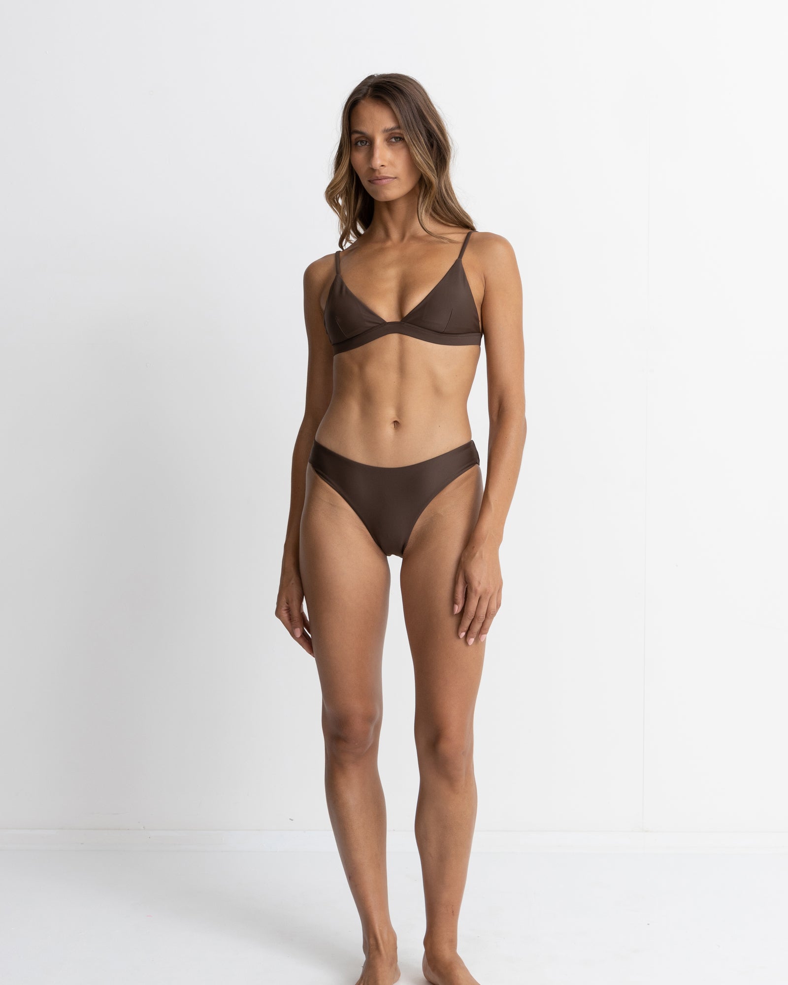 - MODERATE BOTTOM COVERAGE, MID RISE WAIST WITH WIDE SIDE SEAMS FOR COVERAGE, CLEAN FINISHED WAIST BAND EDGE, ZIG ZAG STITCH AT FRONT AND BACK LEG OPENING, METAL COIN LOGO